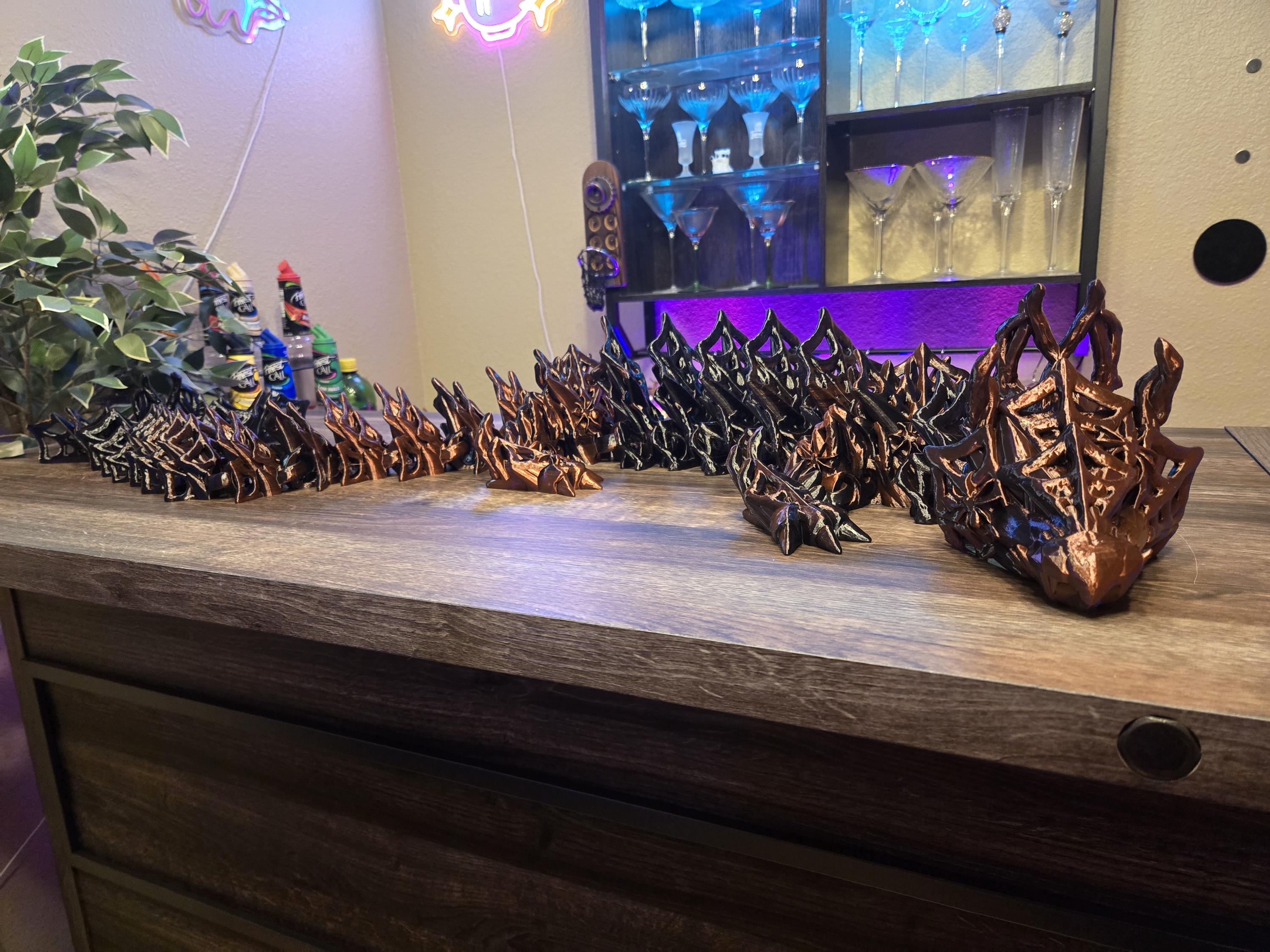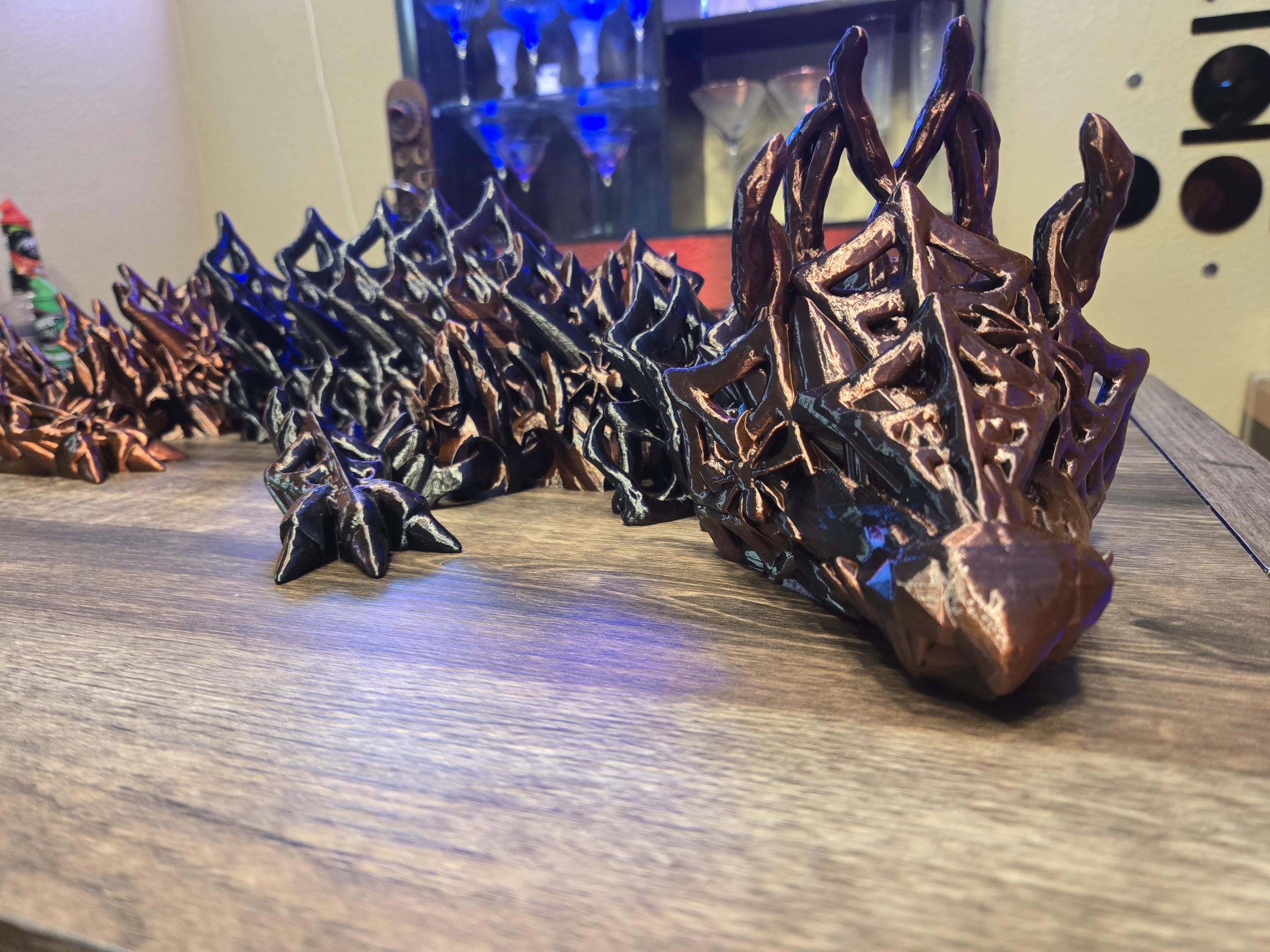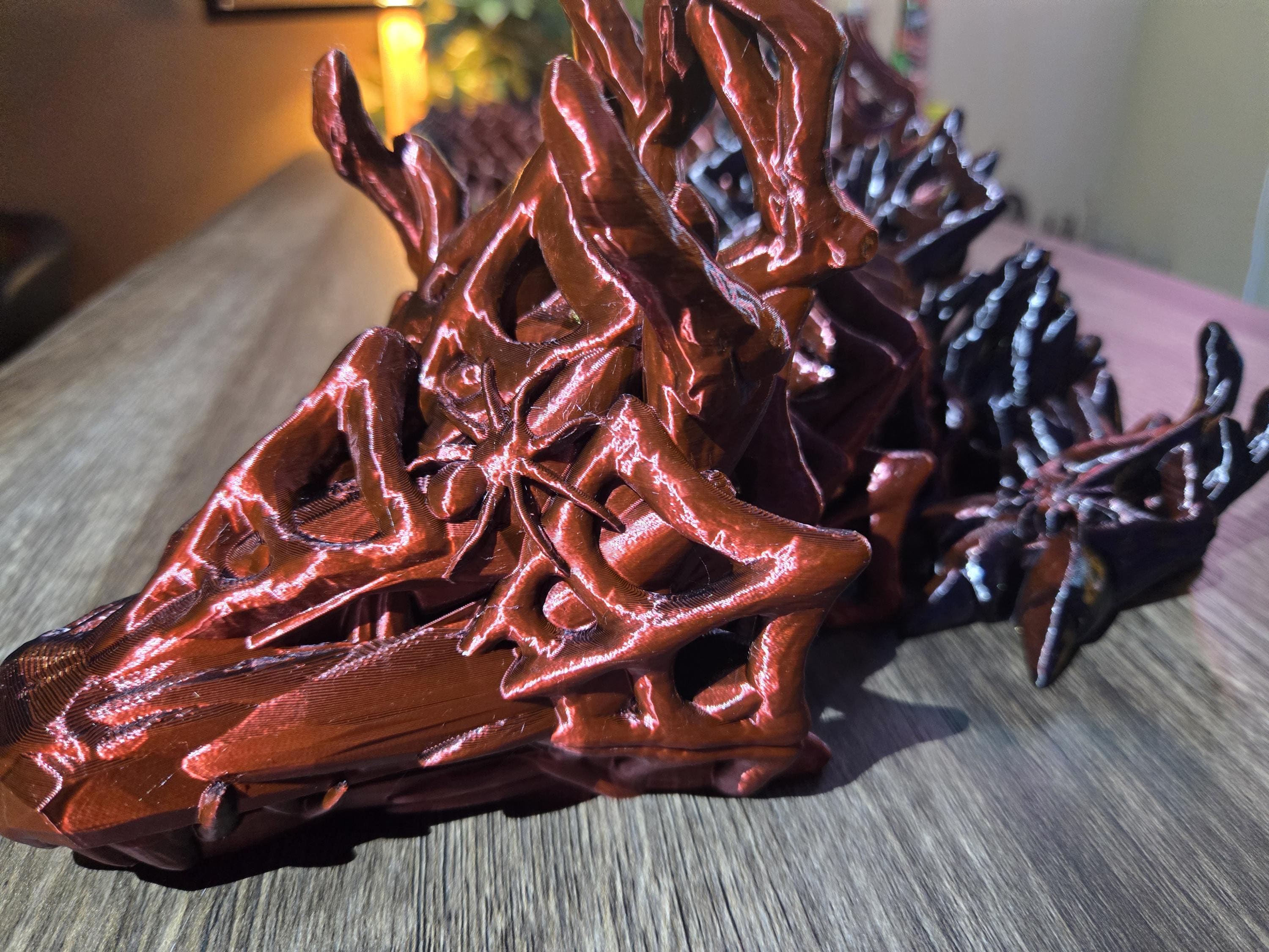 You are purchasing one Giant print to order Cinderwing3D Articulated Wicked Dragon. The size is 50" long. The head, tail, and body move. It is not a toy so it can break if you are too rough with it. With 3d printed art, each piece will be unique so please allow slight variations in color distribution. The same type and color of filament will be used, but the colors may be positioned differently. I also accept requests if you are looking for a different color, size, or model. I am an authorized seller of Flexi Factory prints and Cinderwing3D prints so I can print any of their designs. Choking Hazard, Small Parts: Not for children under 3 years old.